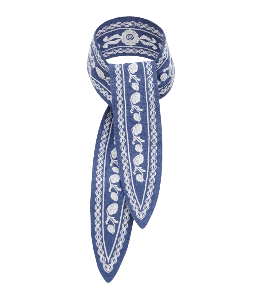 Blue linen handkerchief ‘Dnipryana’ by Etnodim, inspired by the land on either side of the Dnipro River, with white embroidery. Can be worn around the neck or as a hair tie.