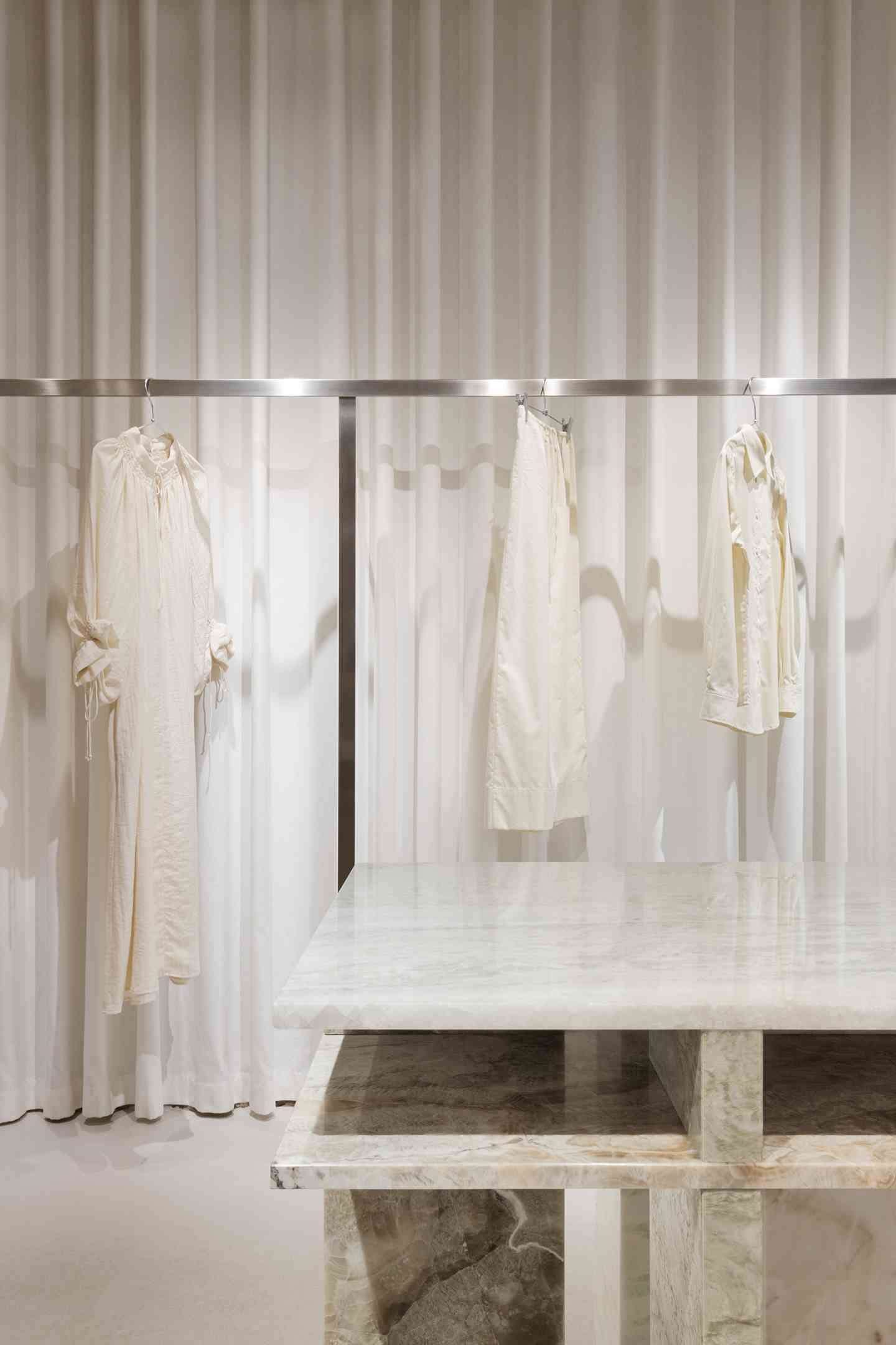 A minimalist showroom for JUL in Lviv, Ukraine, designed by AKZ Architectura. Exposed brick walls, a central large marble table, steel elements and wide white curtains define the space.