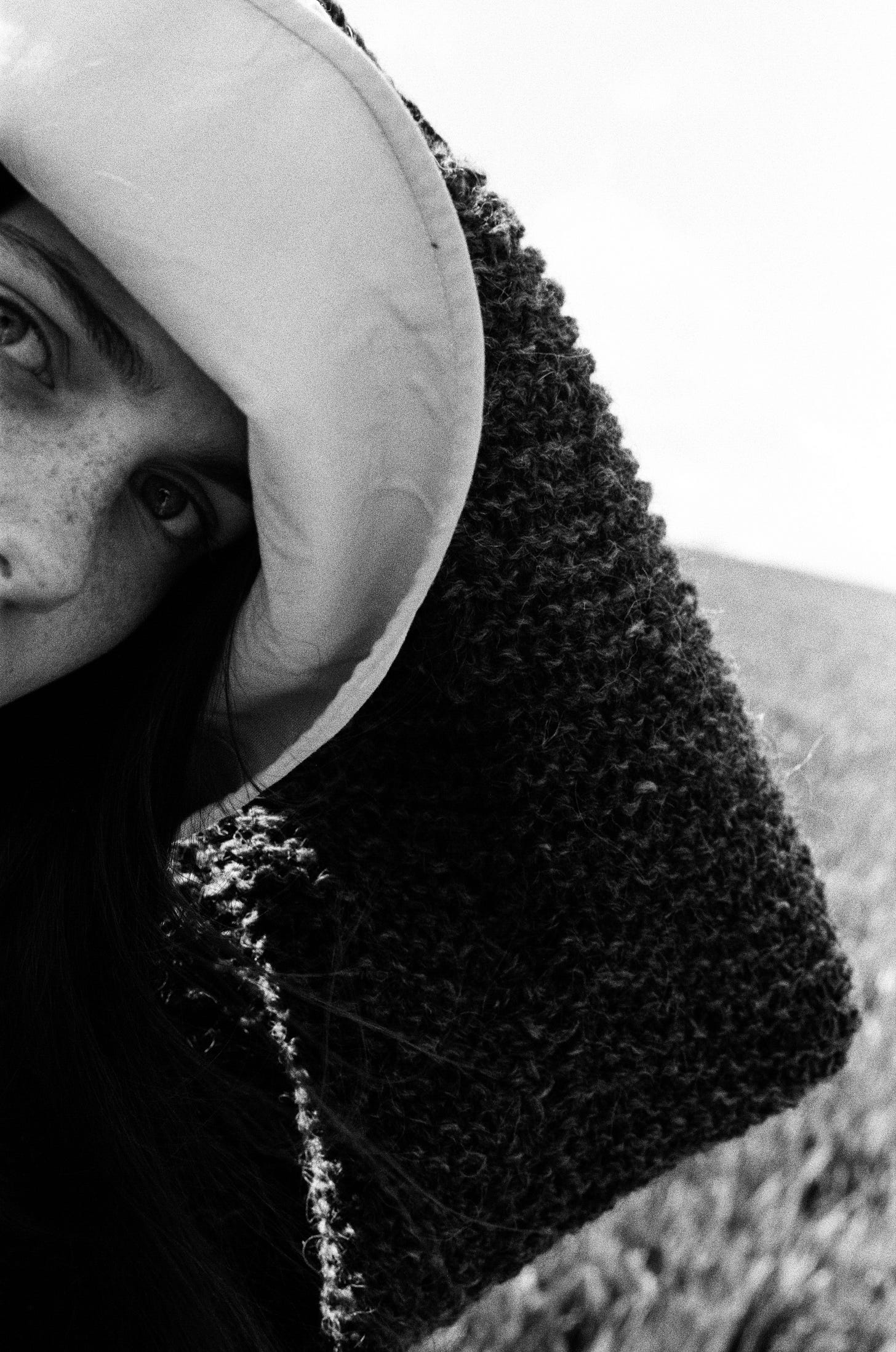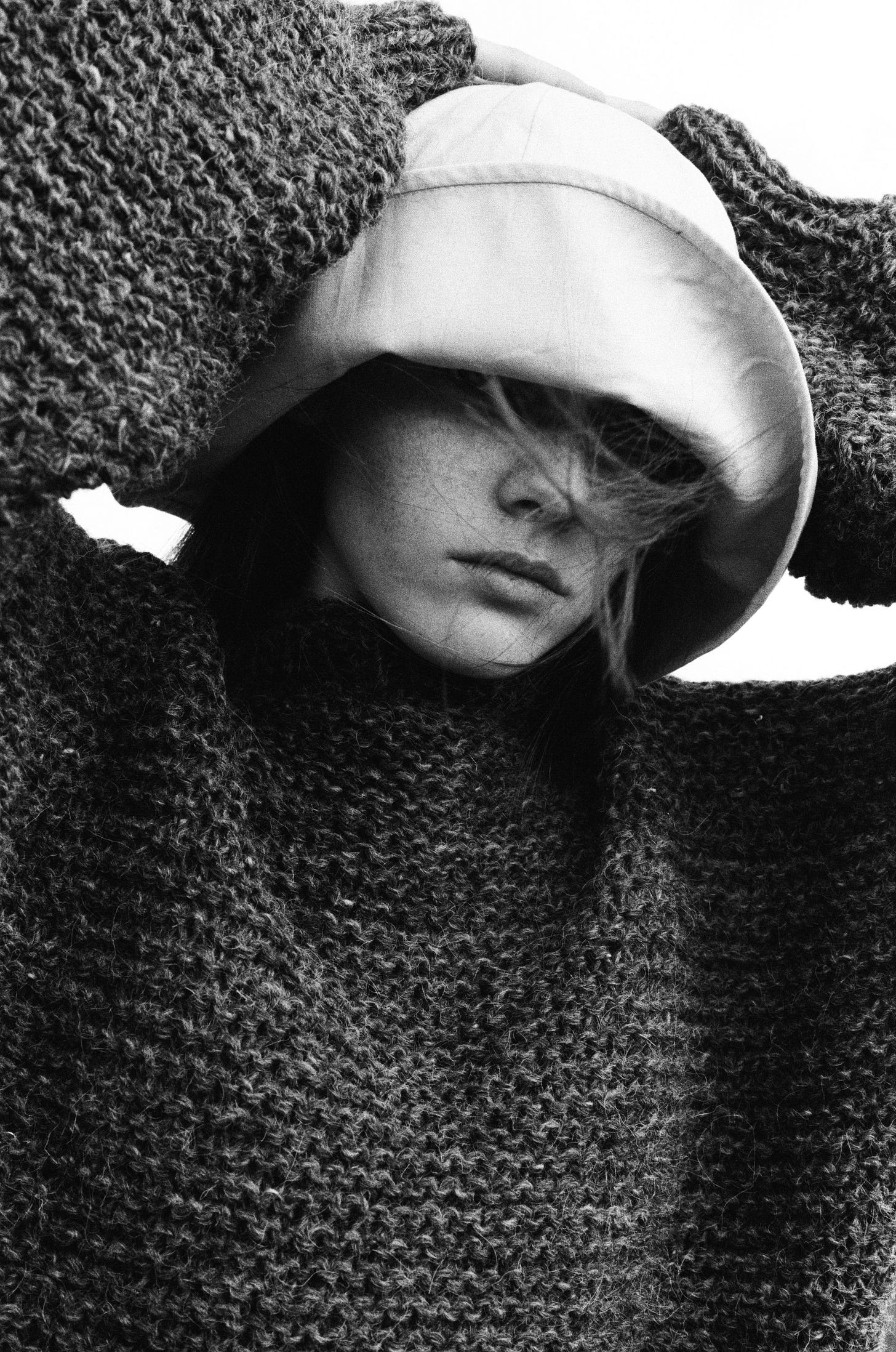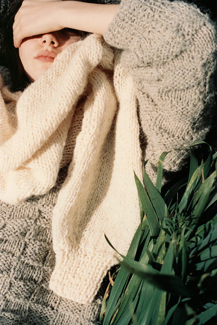 Sophia Roberts by James Robjant, photographed on 35mm as part of my campaign for a project with artisan women in the Carpathian Mountains, preserving cultural heritage. Crafted in four undyed shades - cream, black, dark grey and light grey - each tone was achieved by hand-mixing black and white wool only. Sophia wears the ‘Chess’ design in light grey with ‘Rice’ in cream.