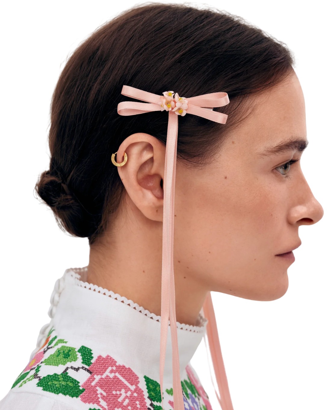 The Nadiia satin ribbon barrette, designed in collaboration with Etnodim. The flowers are made by Kvitny_mo, a craftswoman from Odesa, using the Japanese embossing technique. Each delicate flower is handmade and individually coloured.