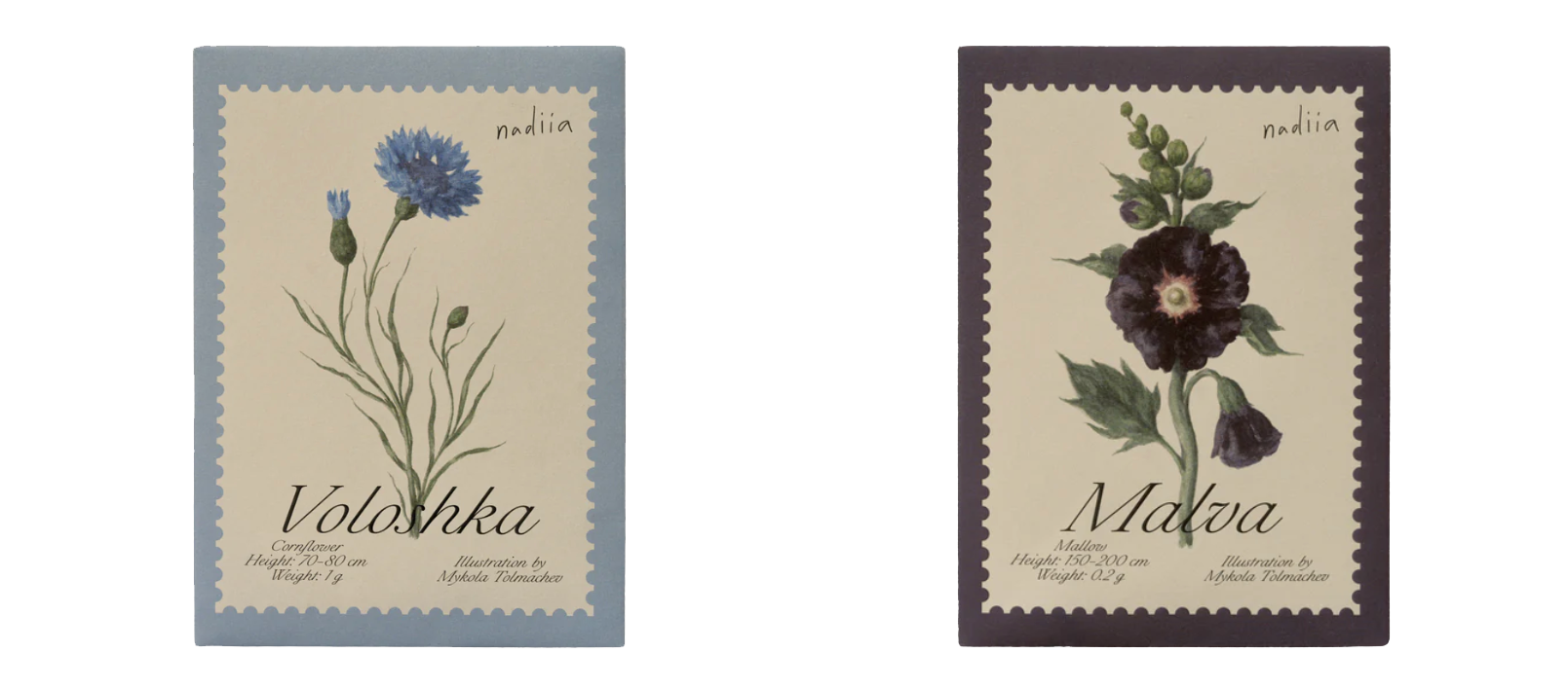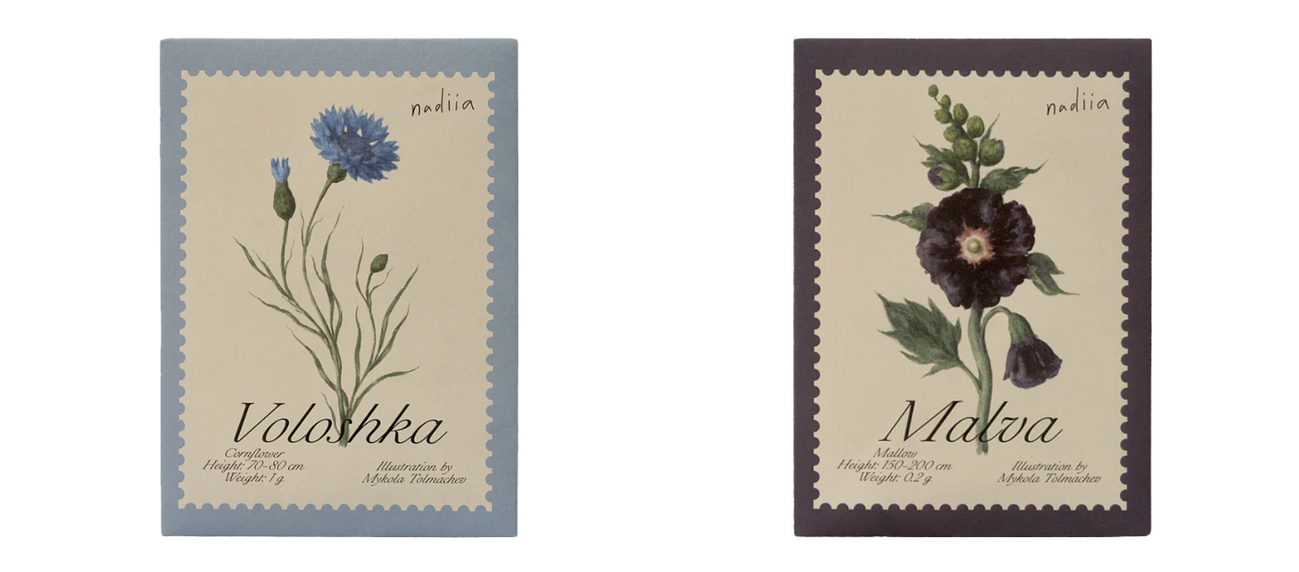 Packets of cornflower and hollyhock seeds, decorated with illustrations by Mykola Tolmachev.