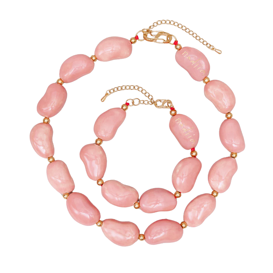 Pink 'Beans' necklace and bracelet by Nadiia, composed of glossy, handmade ceramic beads shaped like beans and carefully decorated by hand.